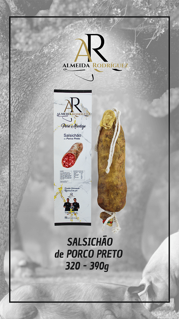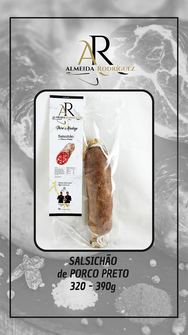 Feito com carne de porco preto, especiarias e um toque de pimenta preta para realçar os aromas e sabores, com mais de 3 messes de cura e selecionado rigorosamente pela Almeida Rodríguez, garantindo a qualidade para conseguir a satisfação de quem confia em nós. Peças de 300g aprox.